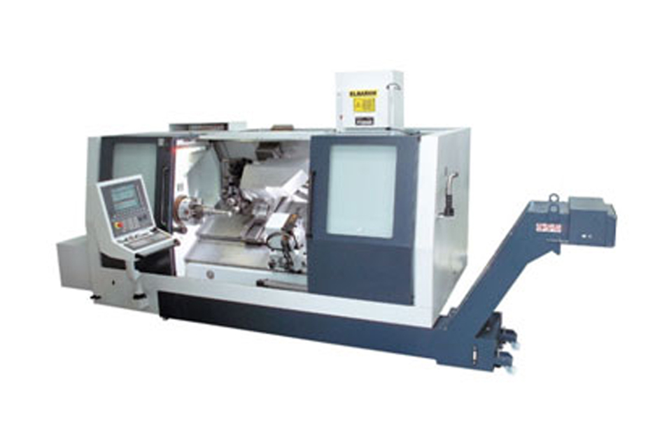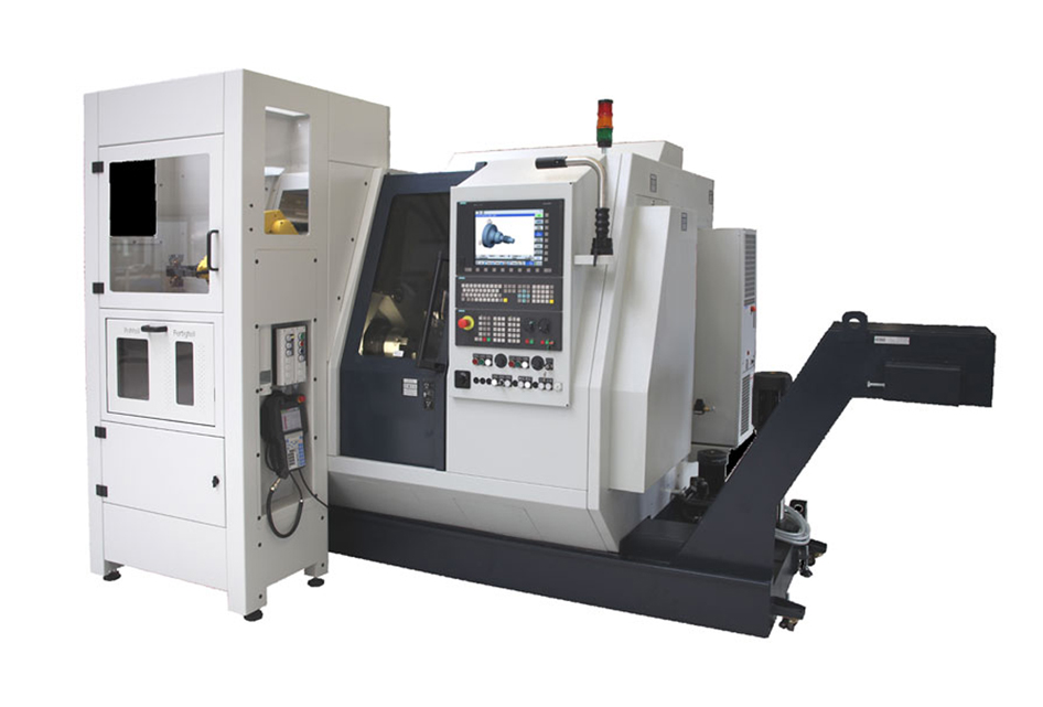 Kot novost predstavljamo dodatne integrirane robotske rešitve za nalaganje in raztovorjanje vpenjalnih kosov. Tokrat kot standardne rešitve za stružnico z dvema revolverjema TTC300. Neposredno v notranjosti stroja je nad zgornjim levim vretenom integriran 5-osni robot, ki skozi majhno pnevmatsko posluževano loputo za nalaganje preko glavnega vretena seže v delovni prostor in poslužuje oba vretena. V sprednjem delu stroja se nahaja integrirani menjalec palet za surove in obdelane kose. Upravljalec ima pri tem še naprej popoln dostop do delovnega prostora za ročno nalaganje, menjavo orodja, proces nastavljanja stroja in nadzor procesa, brez da bi ga enota za avtomatizacijo pri tem ovirala. Hitra, fleksibilna in standardizirano avtomatizirana rešitev tako za majhno kot srednje veliko število kosov na produktivnem stroju za simultano obdelavo.